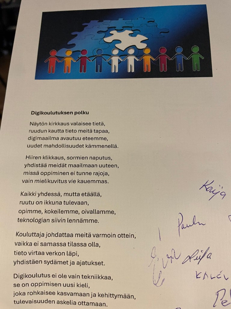 Syksyn 2024 Digisiivet 55+ koulutus saatiin päätökseen Jyväskylässä 24. lokakuuta, kun moduuli 4 huipentui osallistujien upeisiin esityksiin. Tämän moduulin keskiössä oli käytännön projektit, joissa hyödynnettiin koulutuksen aikana opittuja digi-, media- ja tekoälytaitoja. Osallistujat pääsivät esittelemään muun muassa tekoälyn avulla luotuja runoja ja musiikkikappaleita, monipuolisesti tekoälyä hyödyntäneitä videoprojekteja sekä powerpoint-esityksiä, jotka osoittivat luovuuden ja teknologian sujuvan yhdistämisen mahdollisuudet.